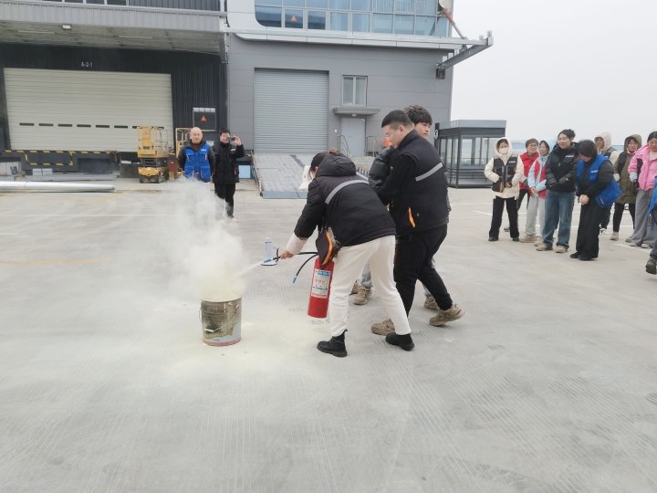 疏散演練結(jié)束后,滅火器的正確使用培訓(xùn)成為重頭戲。在各倉的演練現(xiàn)場,指導(dǎo)員潘宏浩詳細講解了滅火器操作要領(lǐng)。面對熊熊燃燒的模擬火盆,員工們躍躍欲試,紛紛拿起滅火器,按照 “一提、二拔、三握、四壓” 的口訣,對準火焰根部進行噴射操作。